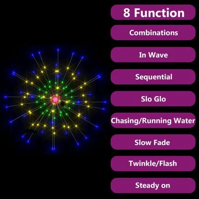The meteor light, equipped with energy-saving LEDs, provides bright and powerful lighting for indoor and outdoor spaces. The light has 8 different lighting effects: combination mode, waves, sequential mode, slowly glowing mode, flashing, slowly fading mode, twinkling and continuous lighting. It is easy to operate the starburst light with the included remote control. Thanks to the flexible copper wires, you can bend them into any shape easily.